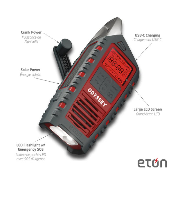 With the built-in solar panel will charge the battery fully in 10-12 hours. Looking for alternative sources of energy? Crank the hand turbine for four minutes and you'll produce enough power for 10-15 minutes of music, news, and weather or one minute of talk time. You can also use the USB-C cable to plug-in to charge the ODYSSEY’S built in rechargeable battery or install 3 AAA alkaline batteries for instant power. To charge your smartphone or tablet, simply plug into the 5V/2.1A output USB port. Power will automatically “dump charge” to your device just like plugging into the wall. The ODYSSEY will provide charge to most smartphones.