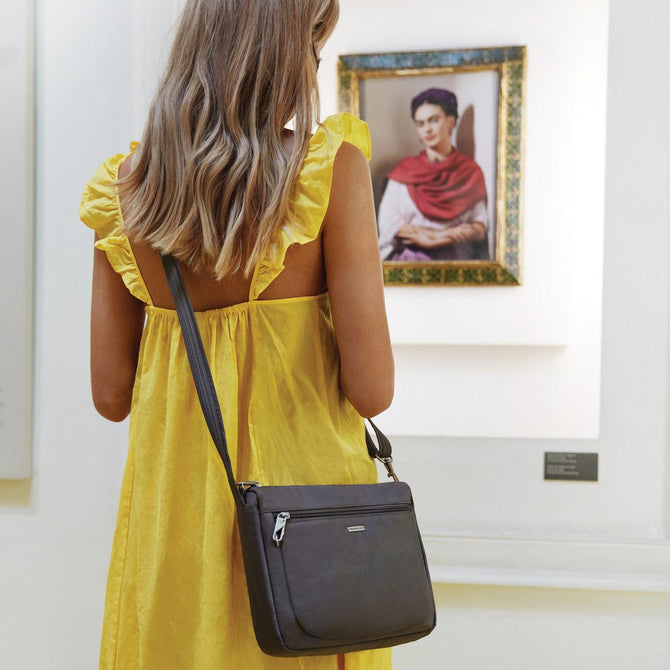 The Travelon Anti-Theft Classic Small East/West Crossbody bag is the perfect go everywhere bag. It features a roomy main compartment with RFID-blocking card and passport slots, an open top pocket, zippered wall pocket and a tethered key clip with LED light. Front and rear zippered pockets are perfect for quick grab items and a smartphone. Travel securely and confidently with Travelon's anti-theft features including slash-resistant construction, locking compartments, and slash-resistant and locking straps to keep you and your belongings protected.