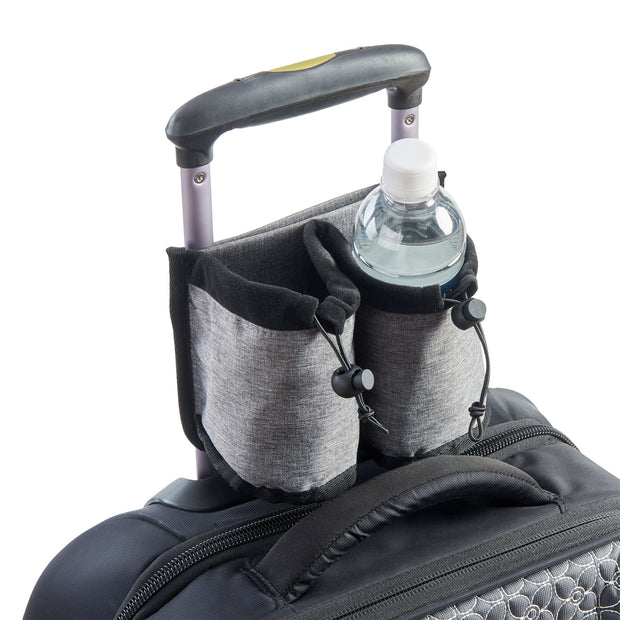 - Fits most wheeled luggage handles and can hold many sizes of drink containers