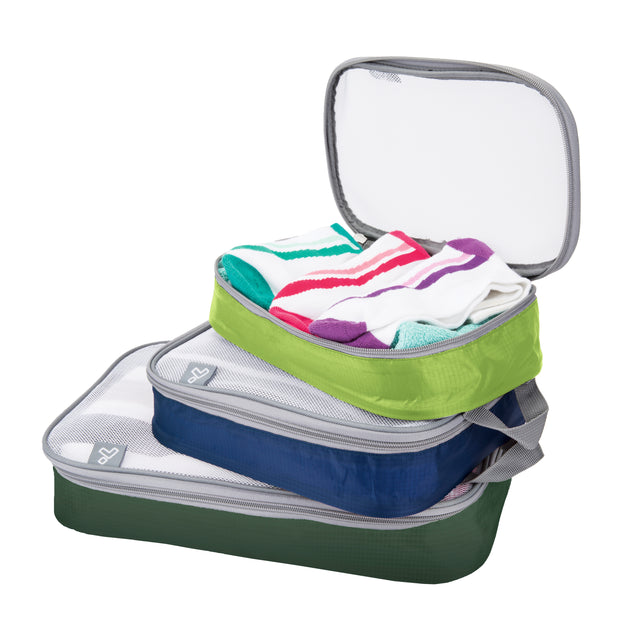 Don't fear a disorganized bag again! The Packing Organizers offer 3 sizes for organized packing without excess weight. Zippers offer easy access to your belongings. Compact design keeps clothes contained and organized. Mesh top is breathable and provides visibility. Piped edges provide structure to each organizer. With three different sizes and colors, you will be able to coordinate and easily find what you’re looking for.