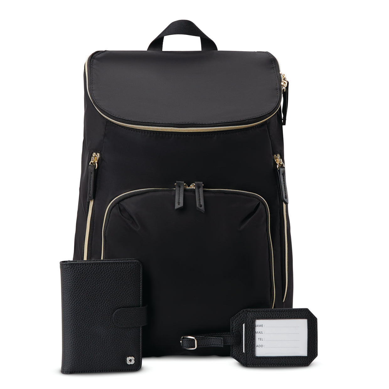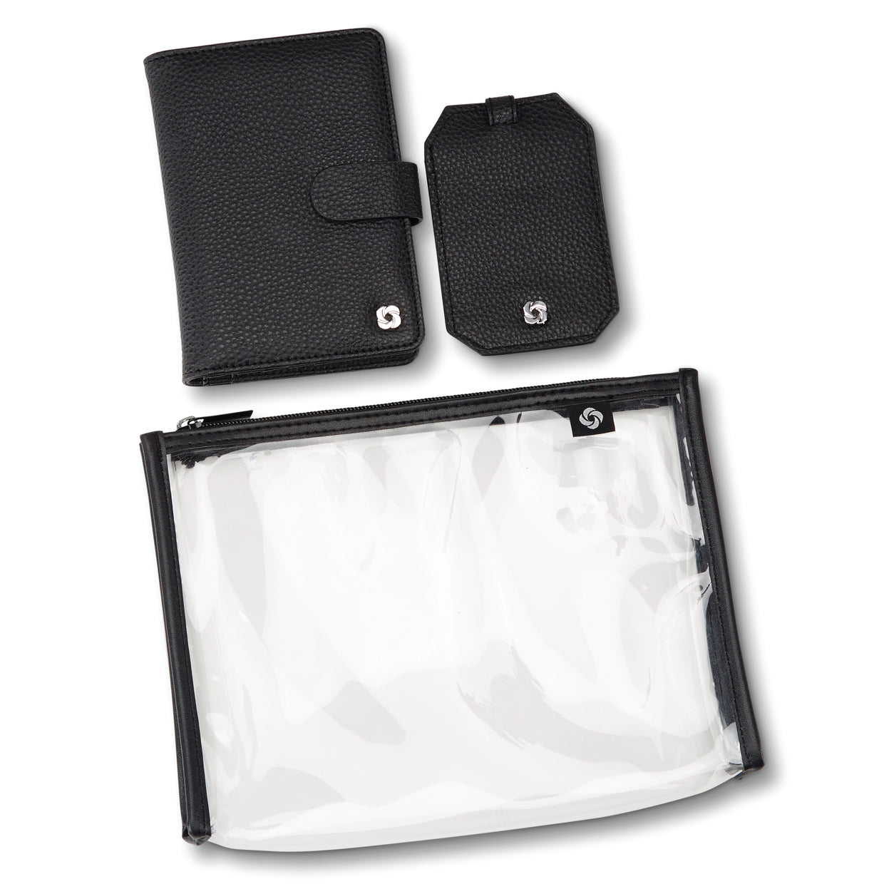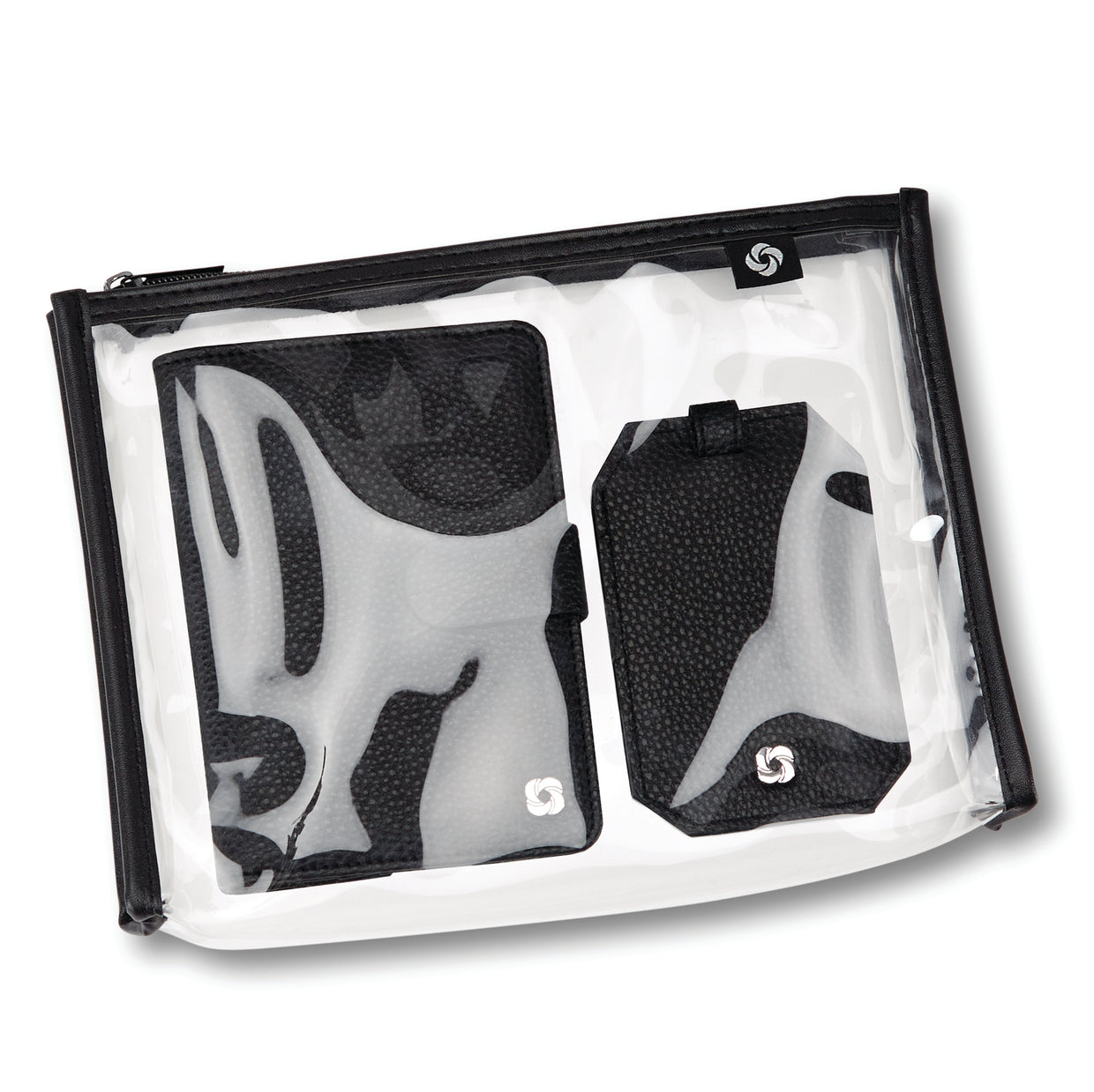 What you need when you're on the go! A passport holder that acts as a mini wallet, a luggage tag to identify your bags, and a bonus clear 3-1-1 pouch for small liquids and essentials.