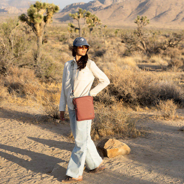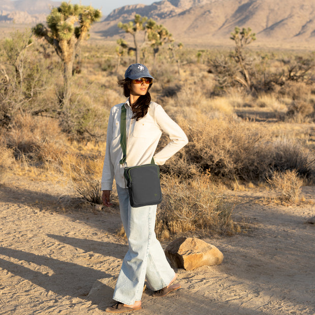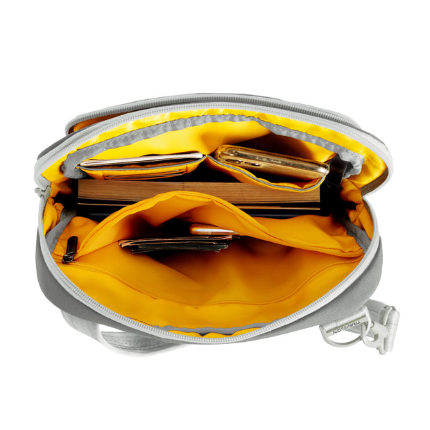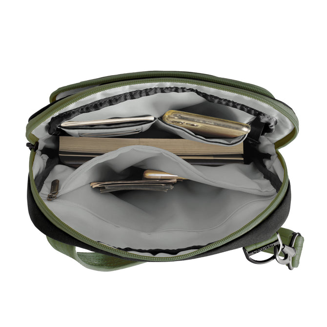 A modern Anti-Theft Slim Bag sized at 10"W x 11"H x 2.5"D, provides the convenience of a hands-free journey that makes bustling markets or an adventure hike stress-free. Blending style, durability, safety, premium organization, slash-resistant and lightweight performance materials (only 0.95 lbs), is a game changing experience. It’s Slash-resistant body and straps; Locking compartments; Lock-down hardware and RFID blocking prevents thieves from breaking into, or snatching, your bag and identity. A 1.75 cubic liter body with command center organization allows you to keep all your essentials within reach.